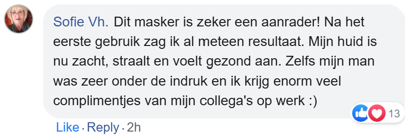 "Ik ben zeer blij met de keuze van dit masker, ik zie er 10 jaar jonger uit! Had dit echt niet verwacht maar het heeft me enorm verrast."